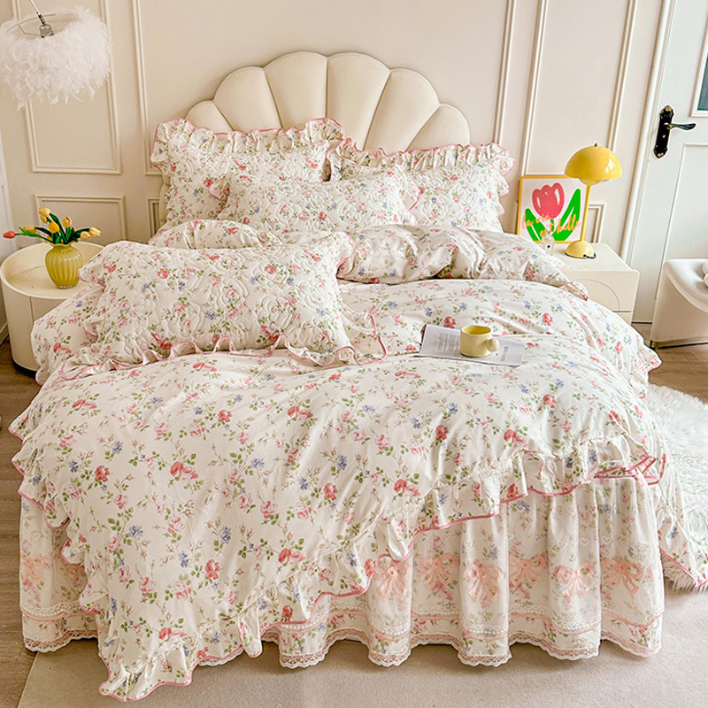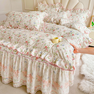 床上四件套小碎花田园风A类全棉夹棉床裙款 100纯棉高级感花边被套