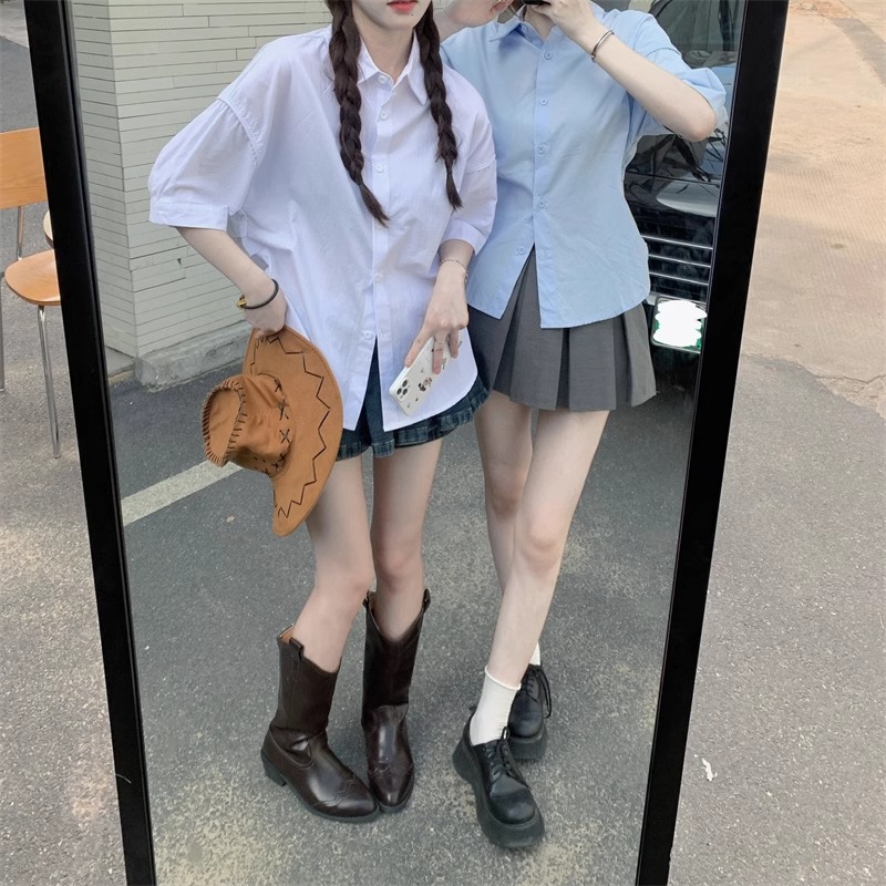 新款 胖mm宽松百搭衬衣polo领开叉薄款 短袖 女大码 上衣 衬衫 2025夏季