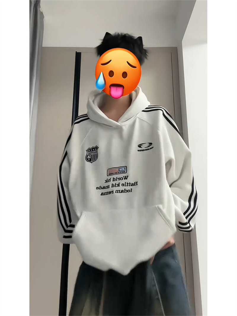 新款 2024春秋季 加绒痞帅三条杠外套 高街oversize连帽卫衣男款 美式