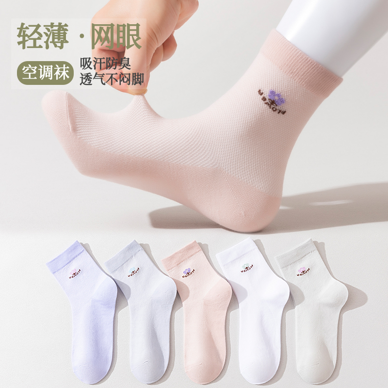 爆款 纯棉防滑中腰2025新款 小花薄款 网眼透气中筒袜子女低腰夏季