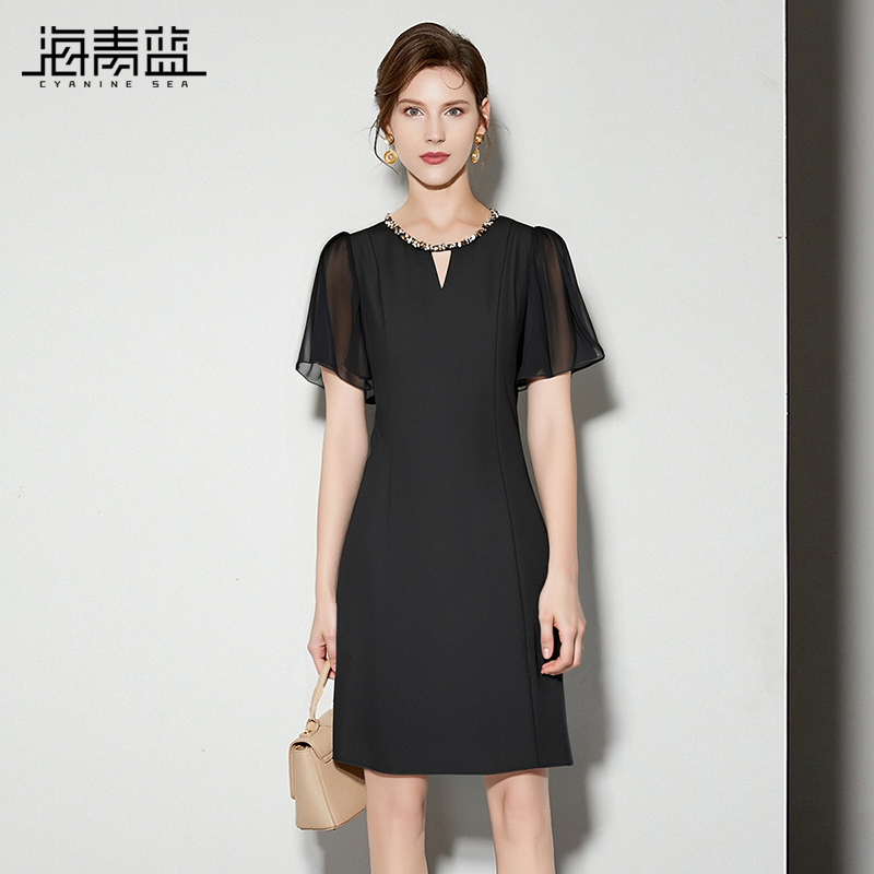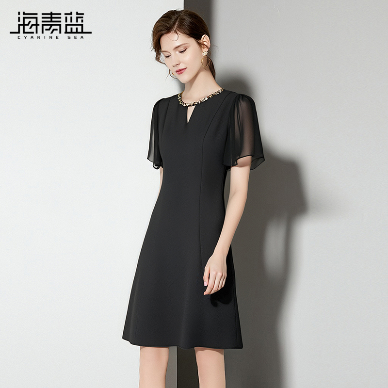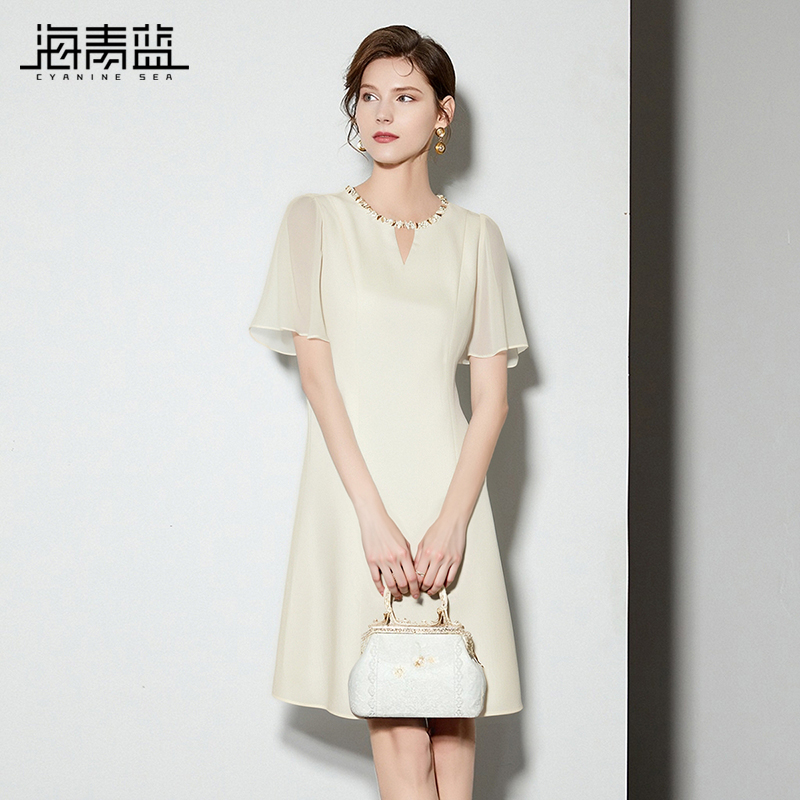 夏季 裙子2025年新款 高级时尚 气质中长款 连衣裙女 海青蓝 短袖 女装