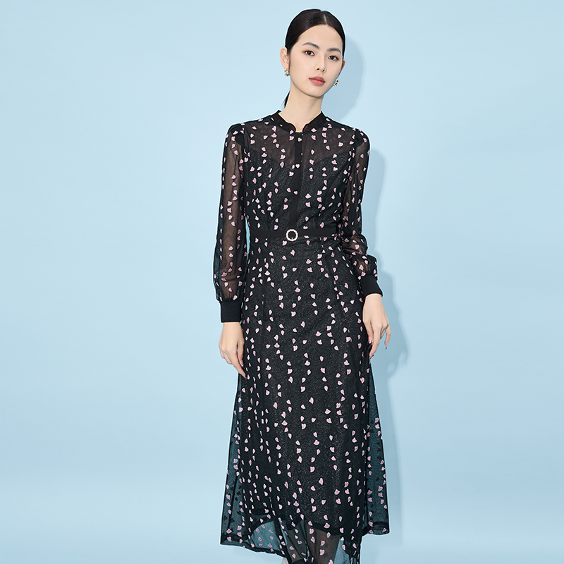 轻熟风印花显瘦设计感长裙 新款 颜域长袖 独特收腰连衣裙女2025冬季