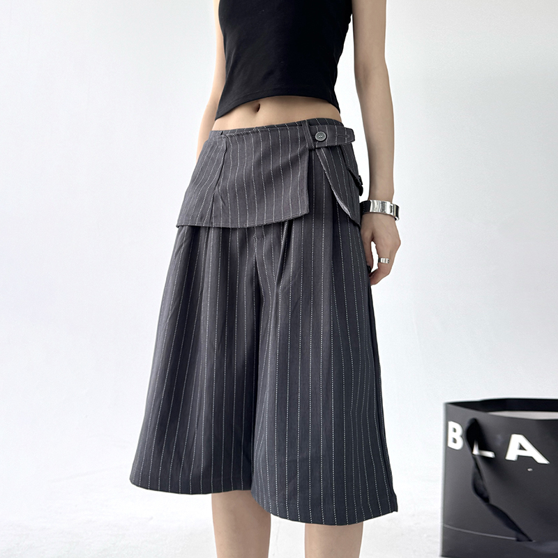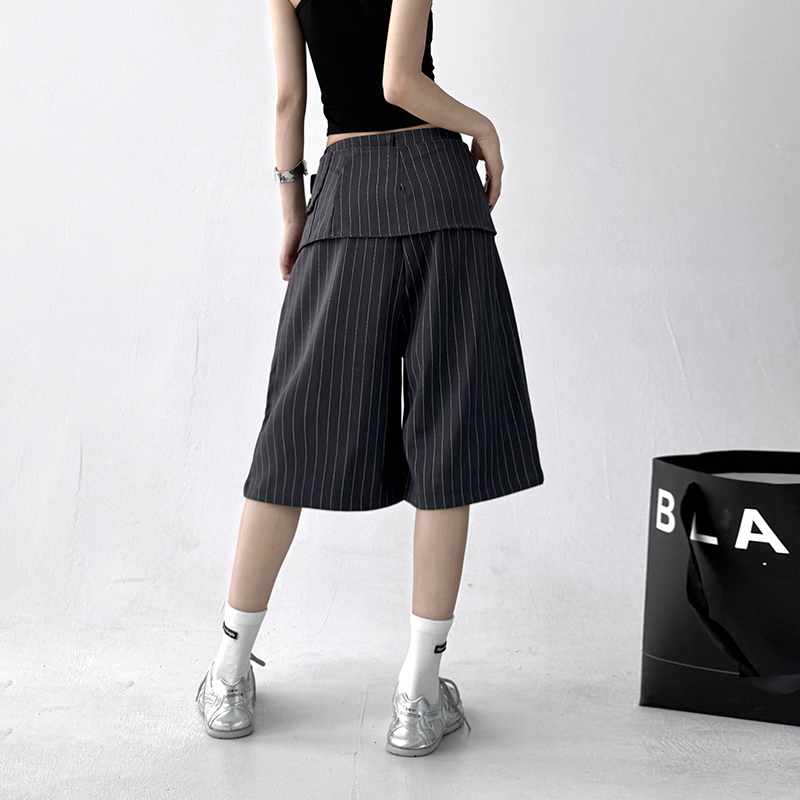 女2025夏季 裤 新款 休闲宽松西装 设计感腰封阔腿裤 超好看条纹五分裤