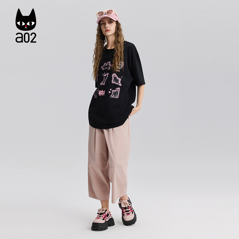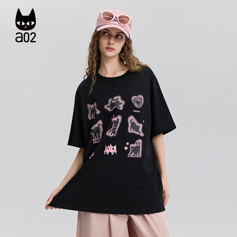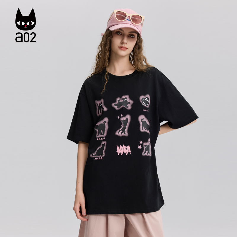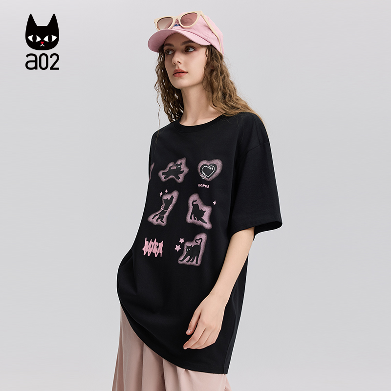 轻薄透气挺括潮牌上衣半袖 夏季 T恤女2025新款 a02宽松圆领黑色短袖