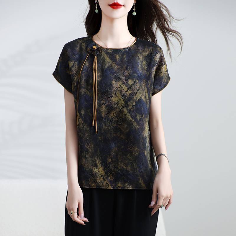 桑蚕丝透气印花T恤夏季 国风短袖 重磅香云纱真丝上衣女新中式 新款