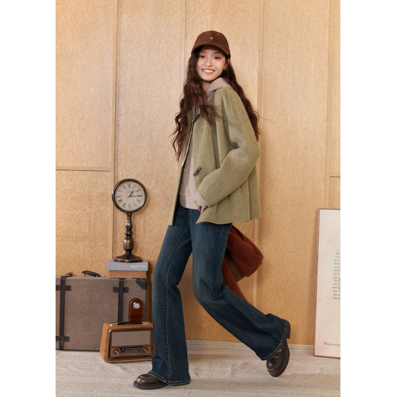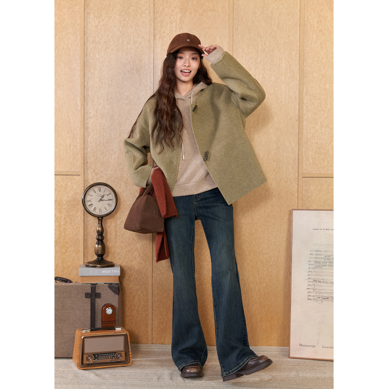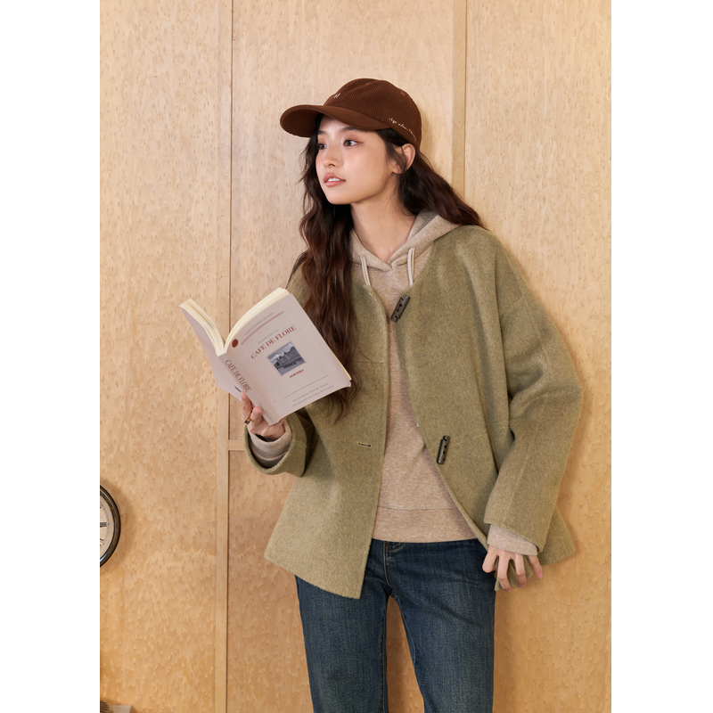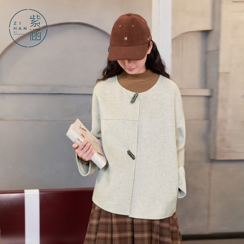 高级感气质宽松保暖外套 新款 紫涵短款 圆领双面羊毛呢大衣女冬季