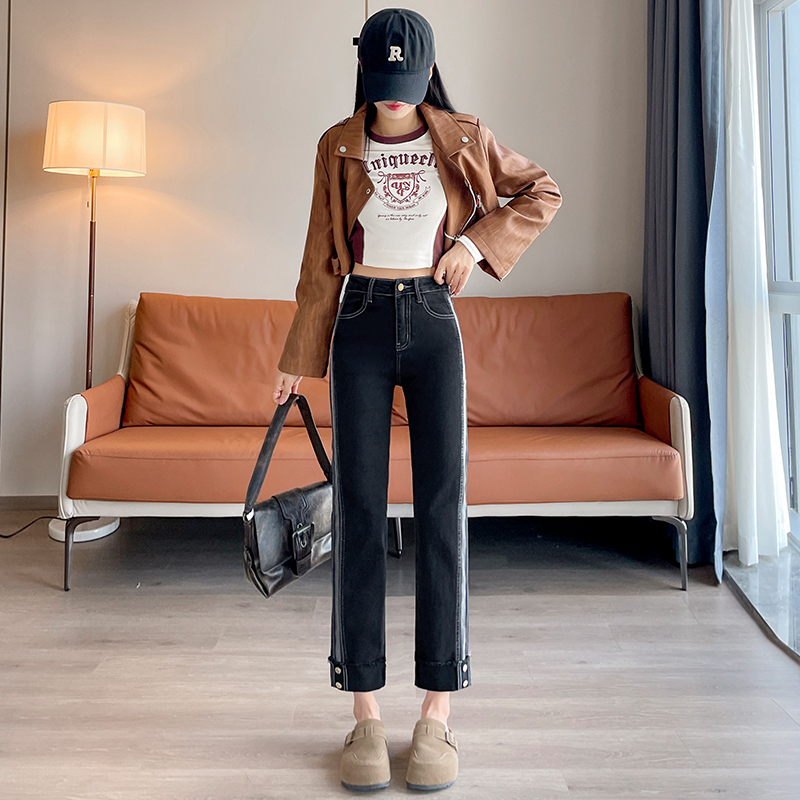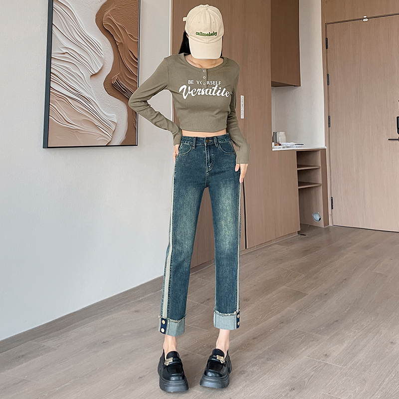 小个子撞色卷边弹力复古八分法棍裤 2025新款 女夏季 高腰烟管牛仔裤