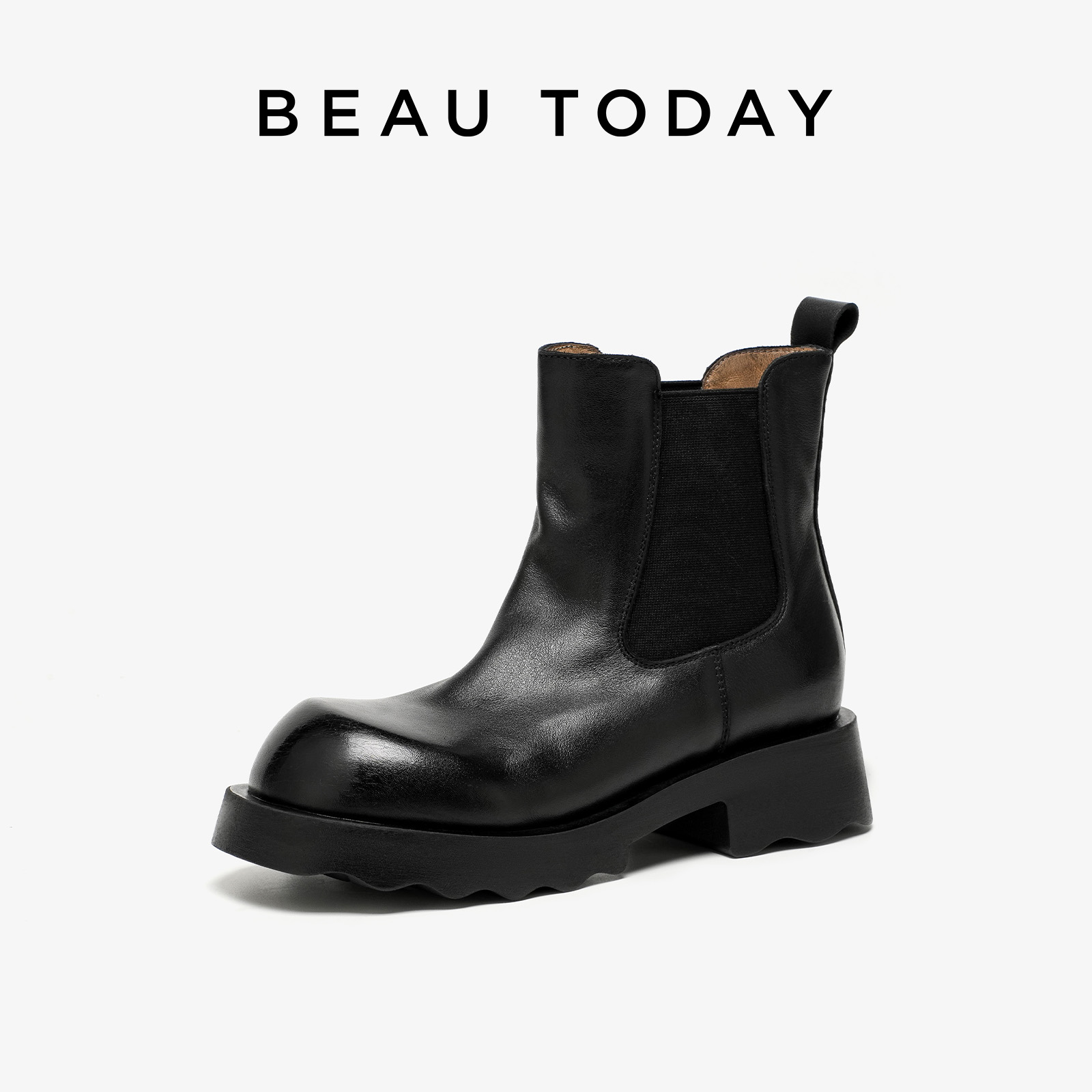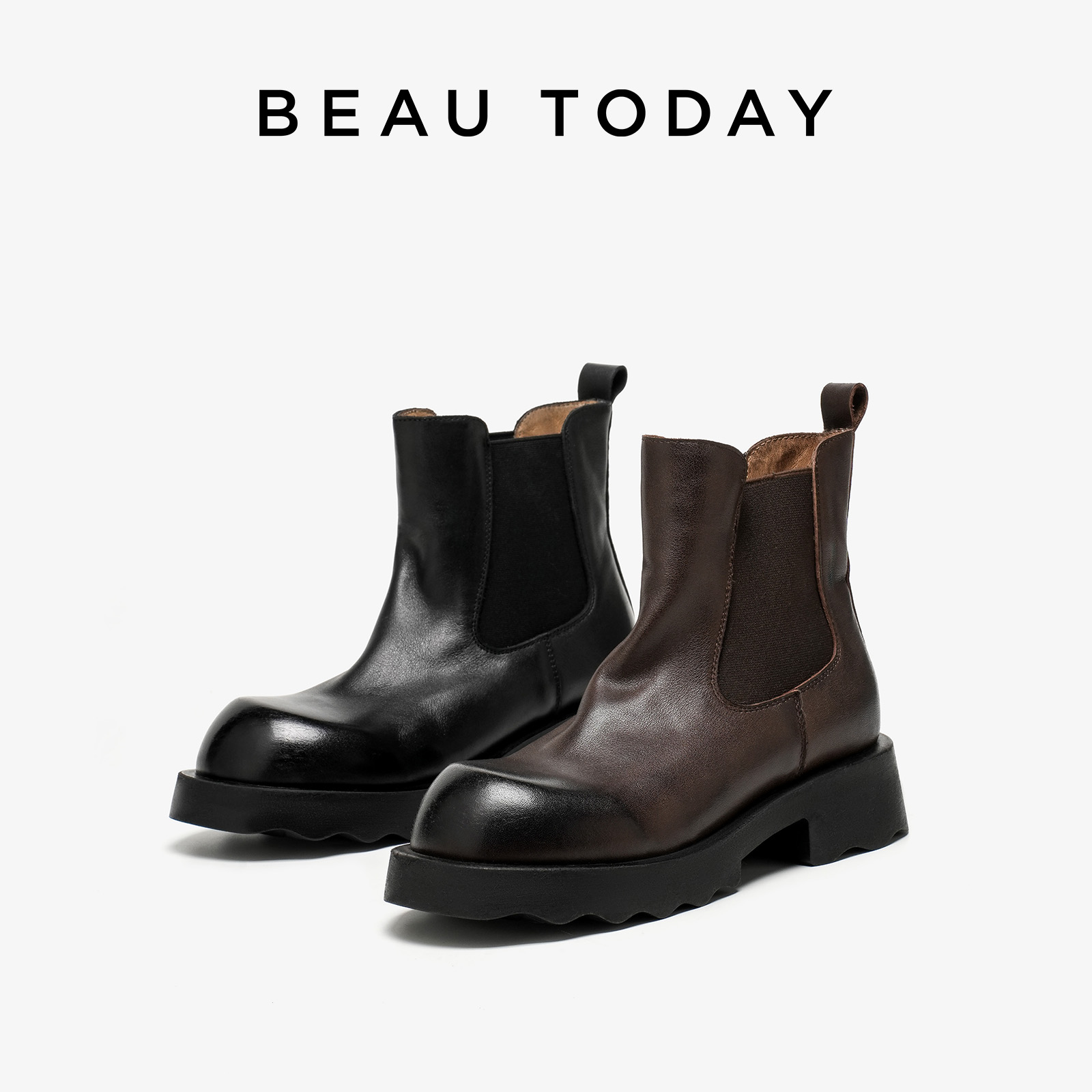 BeauToday黑色切尔西靴女真皮烟筒靴厚底复古短靴女 清仓款