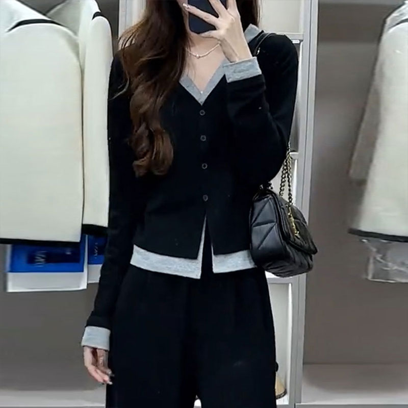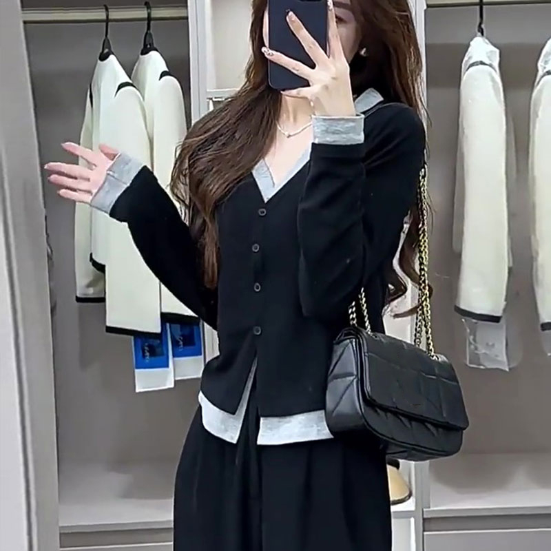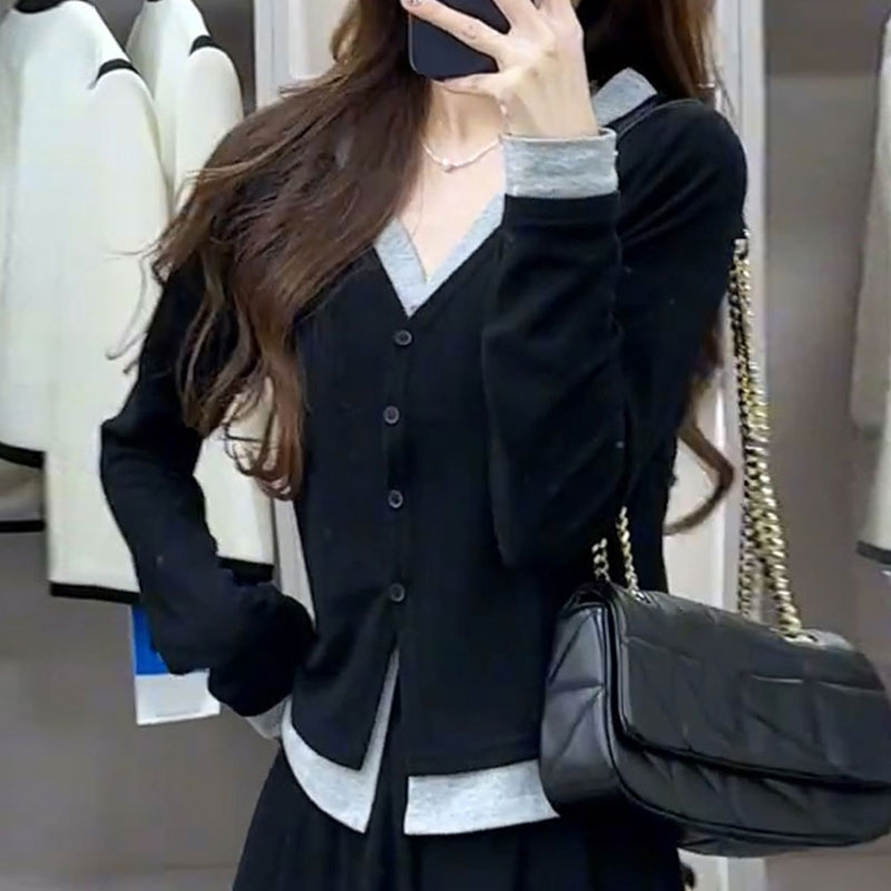 韩版 T恤女秋季 修身 内搭外穿短款 上衣潮 纽扣开衫 打底衫 假两件长袖