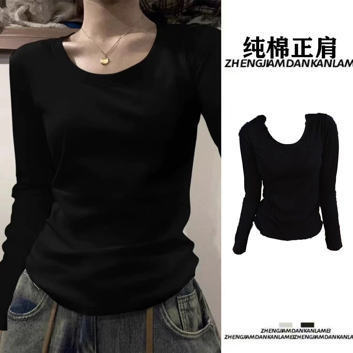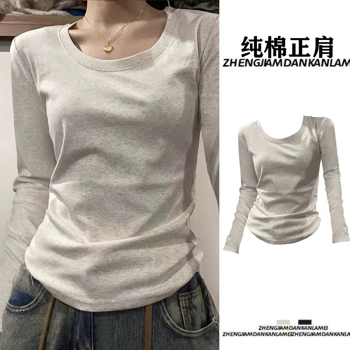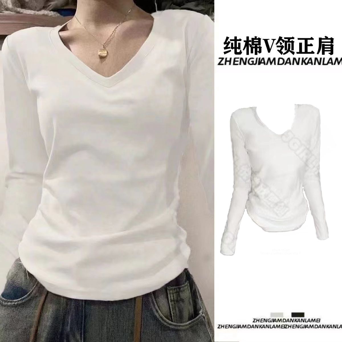 设计感百搭修身 T恤女春秋冬新款 显瘦打底上衣 V领纯棉正肩长袖 美式