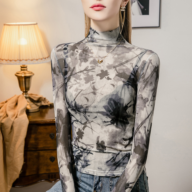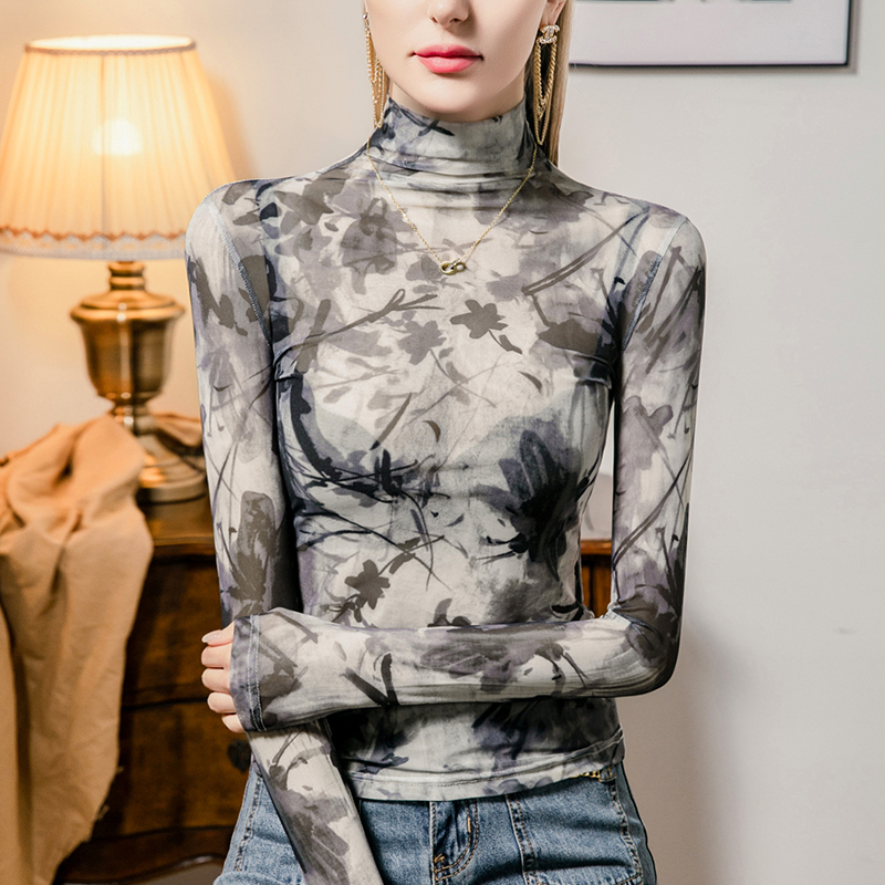 新款 上衣小衫 高领印花网纱打底衫 内搭长袖 女复古性感女装 2025秋季