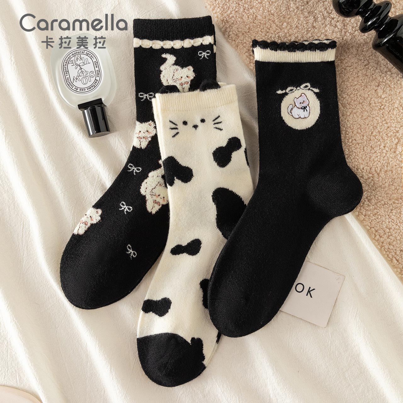 caramella袜子女秋冬新款 女士中筒袜黑色羊毛袜保暖加厚可爱女袜
