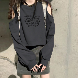 上衣ins 复古小个子宽松T恤高腰短款 设计感露肩长袖 t恤女春秋美式