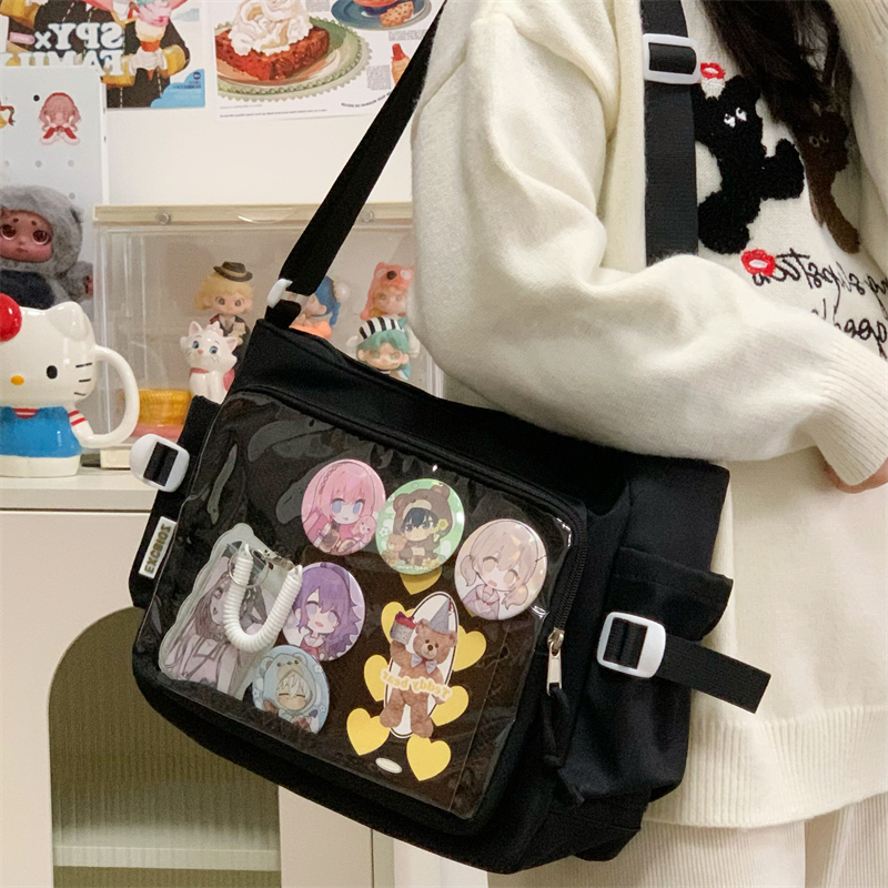 二次元 学生黑色透明单肩挎包男生肩包男 扎吧唧痛包斜挎大容量男款