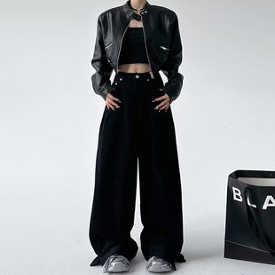 女春秋新款 休闲直筒慵懒松弛感裤 高腰垂感窄版 裤 子 西装 黑色阔腿裤