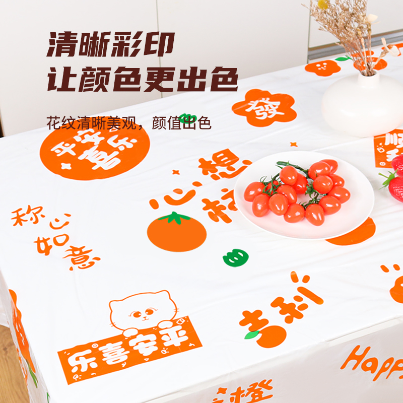 心想柿橙印花一次性桌布长方形新年聚餐台布圆桌加厚家用乔迁新居