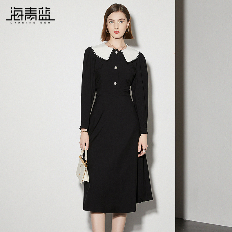 收腰显瘦连衣裙短裙春 新款 阔色针织长袖 拼接花苞小黑裙女2025秋季