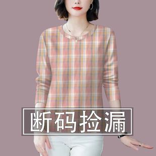 清仓捡漏外贸折扣妈妈中老年格子打底衫 遮肚T恤女上衣潮 减龄长袖