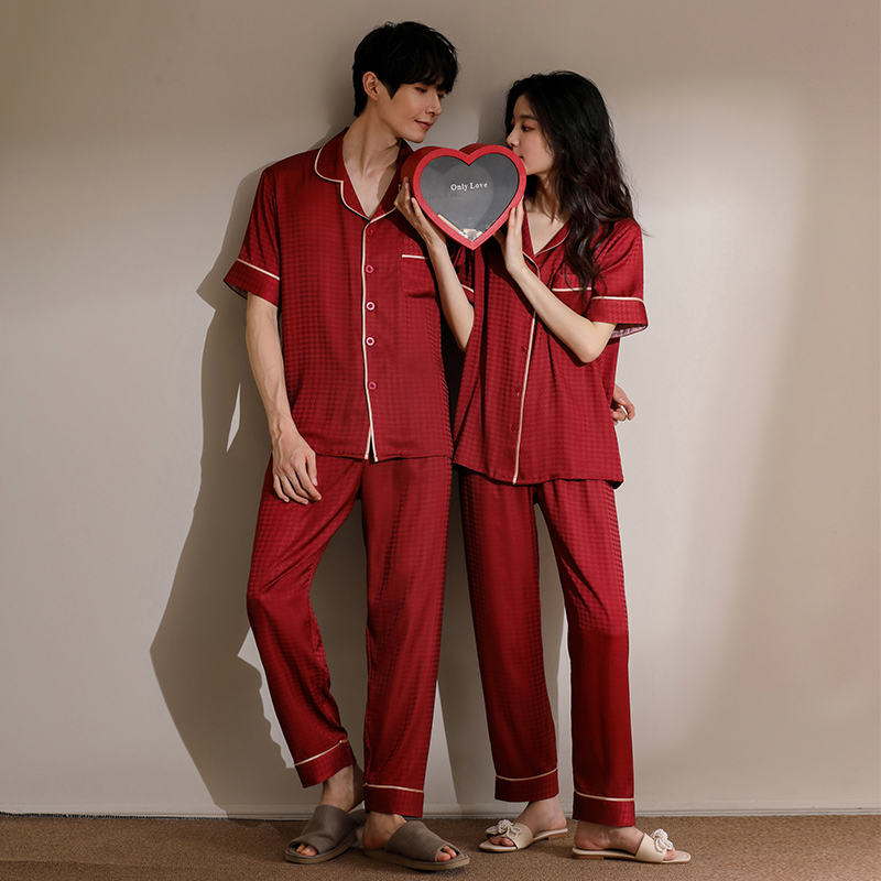 千鸟格本命红色新婚结婚家居服男套装 长裤 短袖 冰丝情侣睡衣女夏季