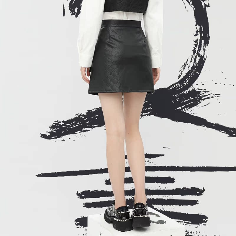 金苑裙子女2022秋季 黑色潮流拉链皮面设计感a字半身裙B223109 新款