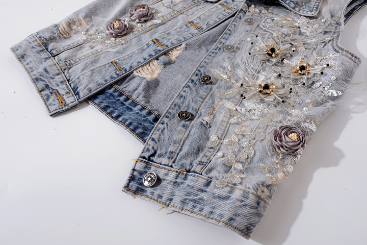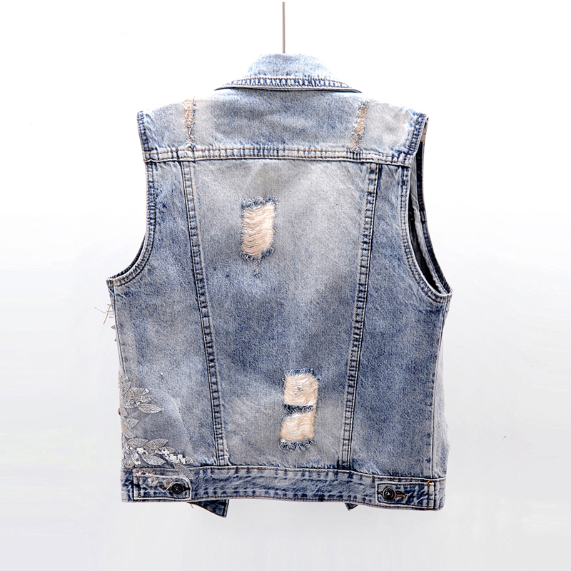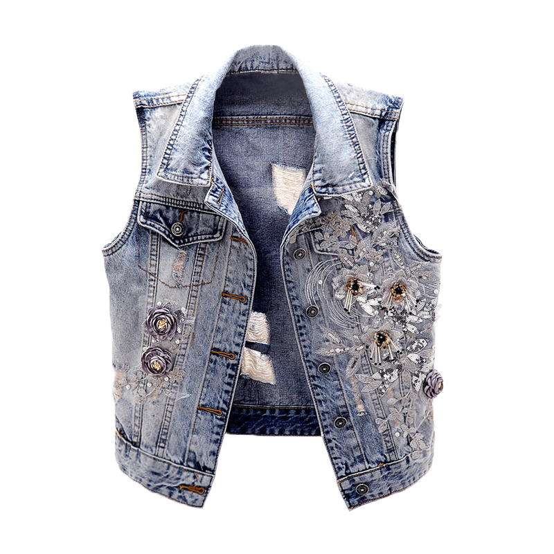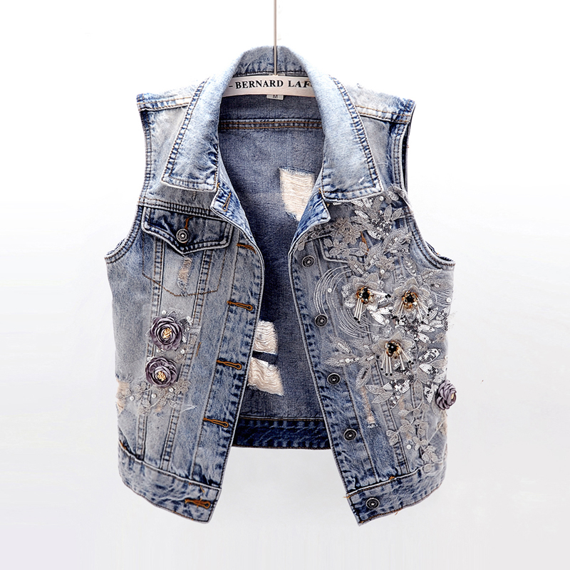 无袖 春秋季 破洞牛仔马甲女短款 重工刺绣花朵大码 背心坎肩上衣 韩版