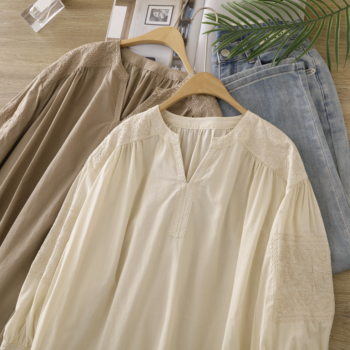 小众薄款 重工刺绣V领中袖 法式 宽松棉质灯笼袖 气质上衣女 衬衫
