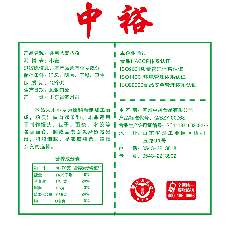 中裕面粉多用途麦芯粉4kg 中筋馒头包子饺子家用通用山东小麦粉