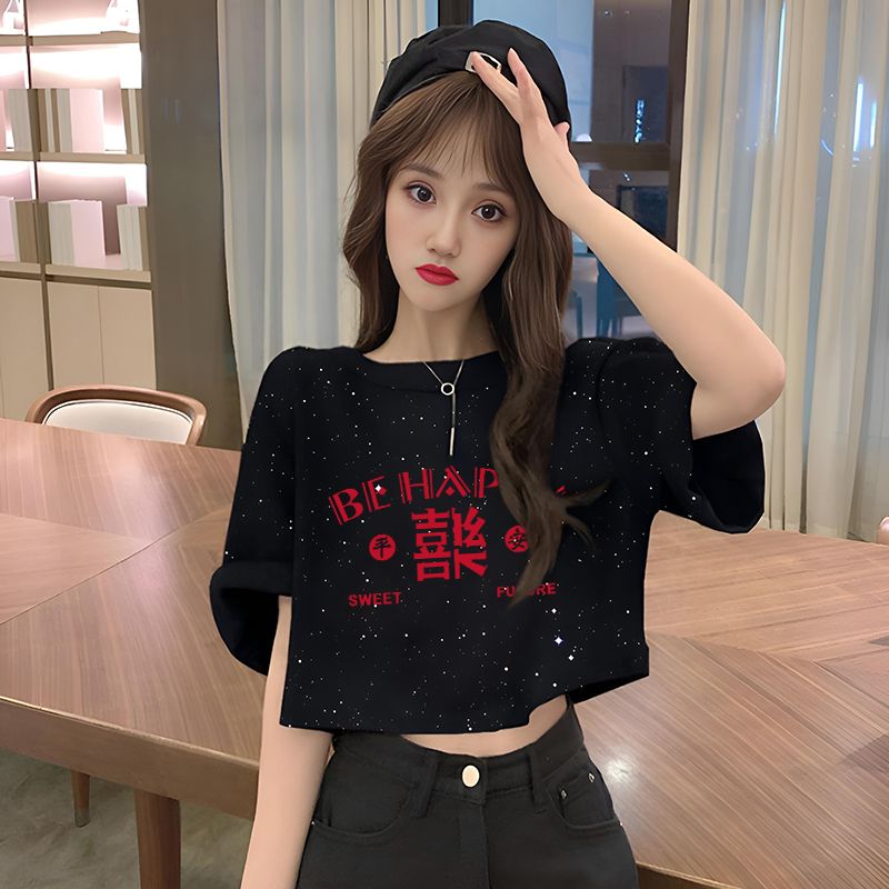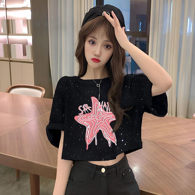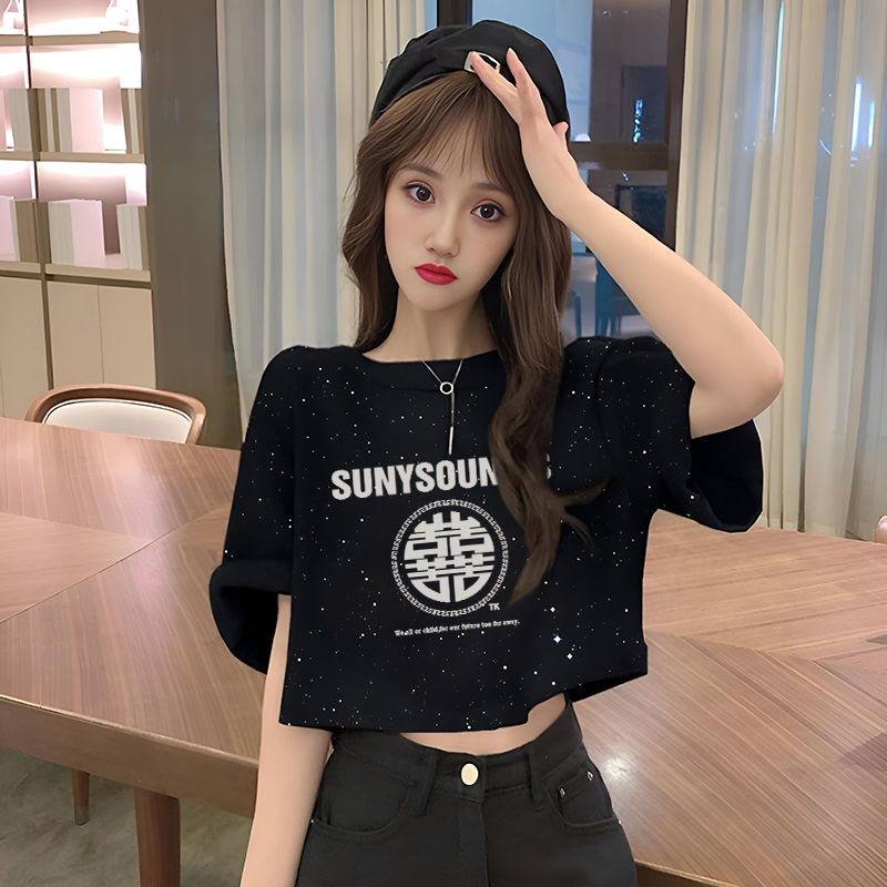 韩版 新款 宽松小众甜辣设计感珠片露脐上衣 T恤女2025夏季 黑色短袖
