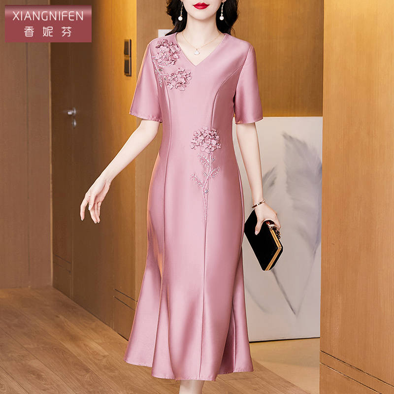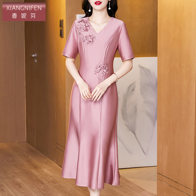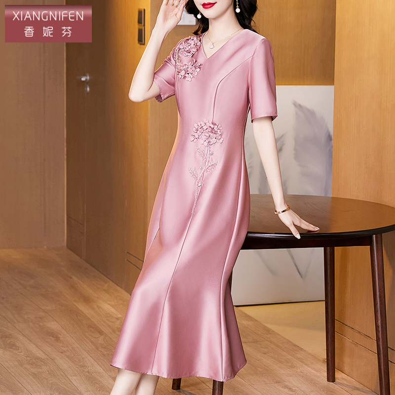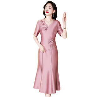 dfvc洋气桑蚕丝真丝丝绒连衣裙女2025年秋季 蕾丝拼接中长裙子 新款
