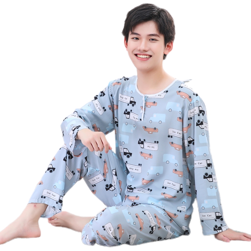 儿童长袖 绵绸套装 棉绸睡衣男童男孩空调家居服 青少年大童薄款 夏季
