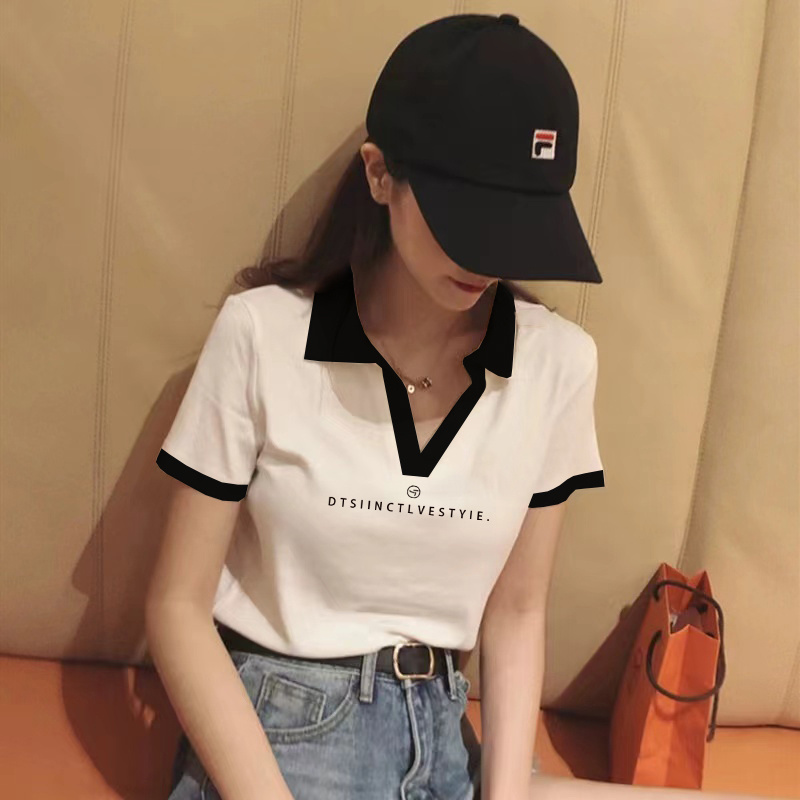 设计感小众撞色百搭上衣 2025新款 正肩t恤女纯棉polo领短袖 无扣衫