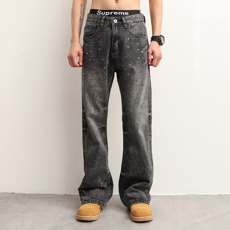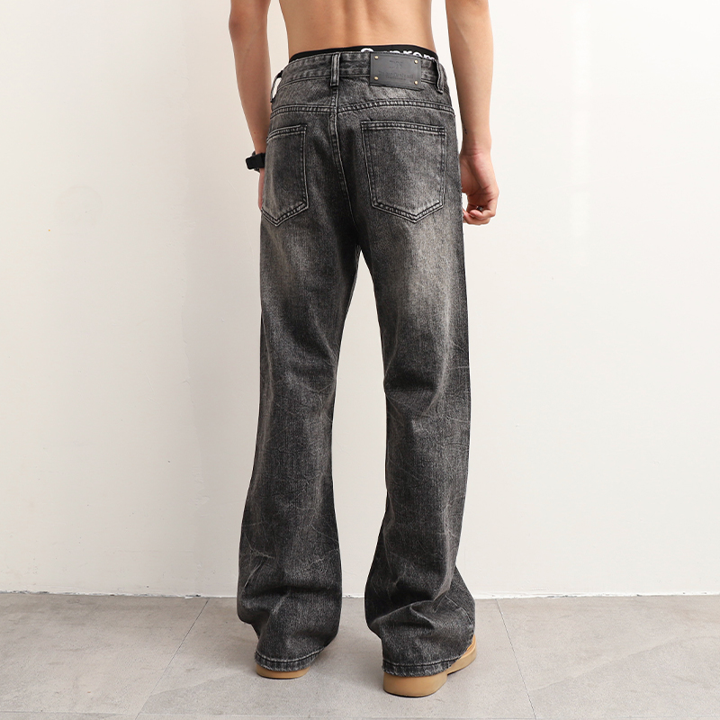 春秋百搭休闲阔腿长裤 豪霆.复古水洗宽松直筒cleanfit牛仔裤 男士