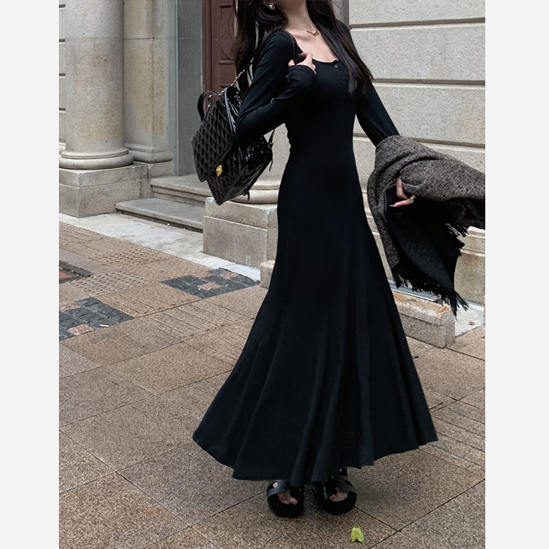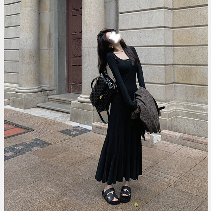 新款 2025秋季 黑色轻奢气质连衣裙女针织裙子小黑裙 黑标 DPLAY