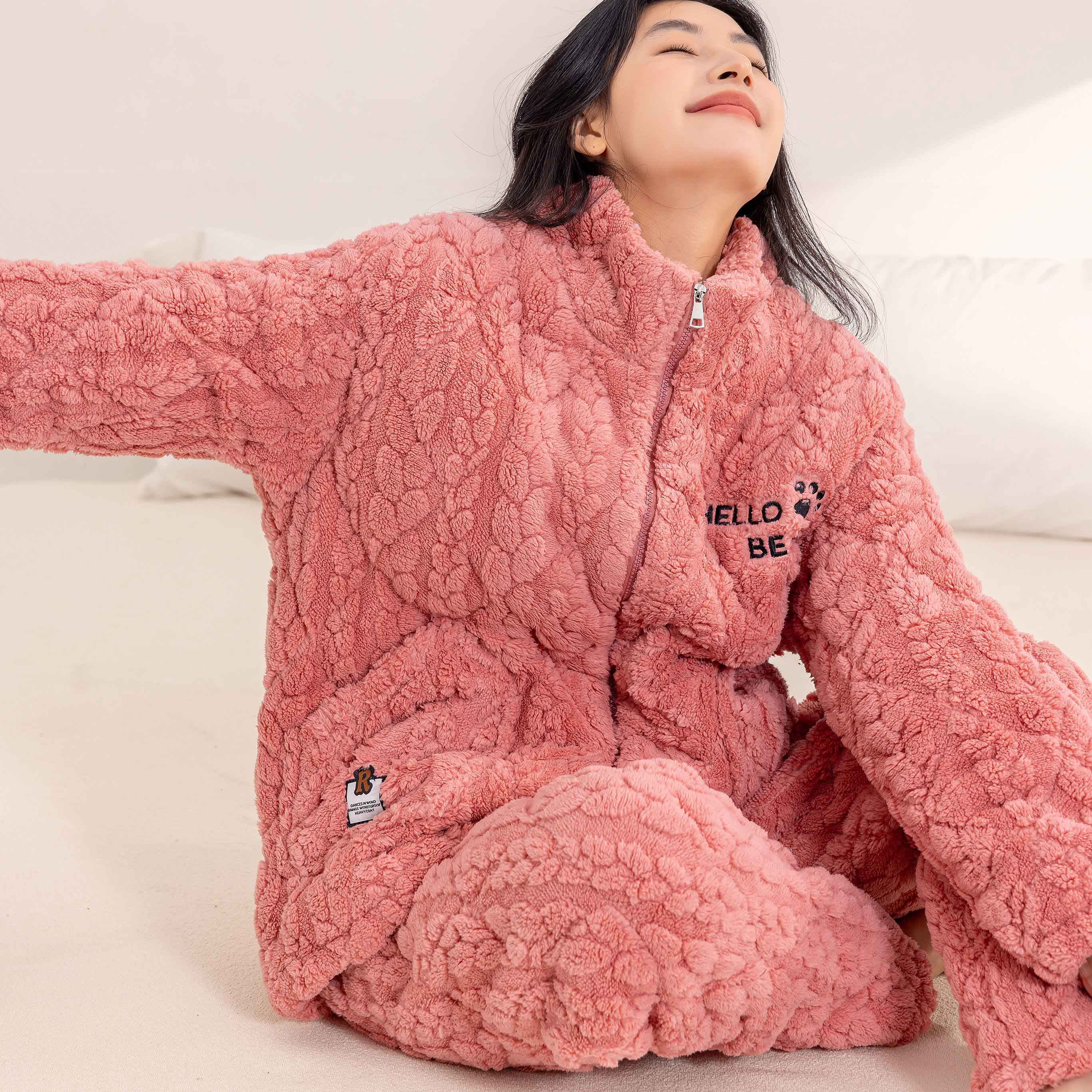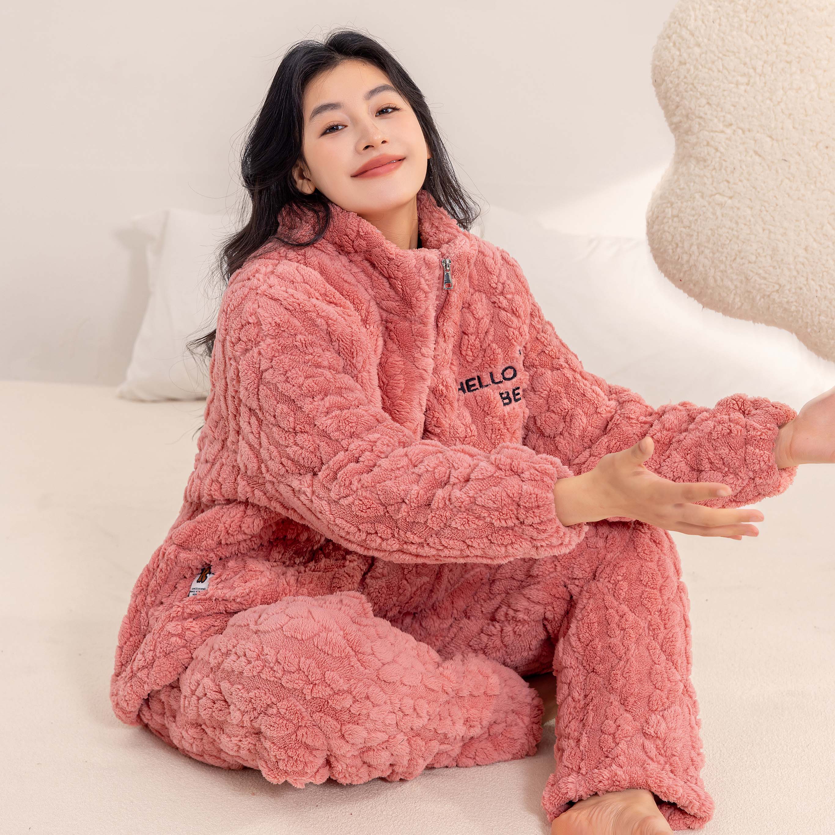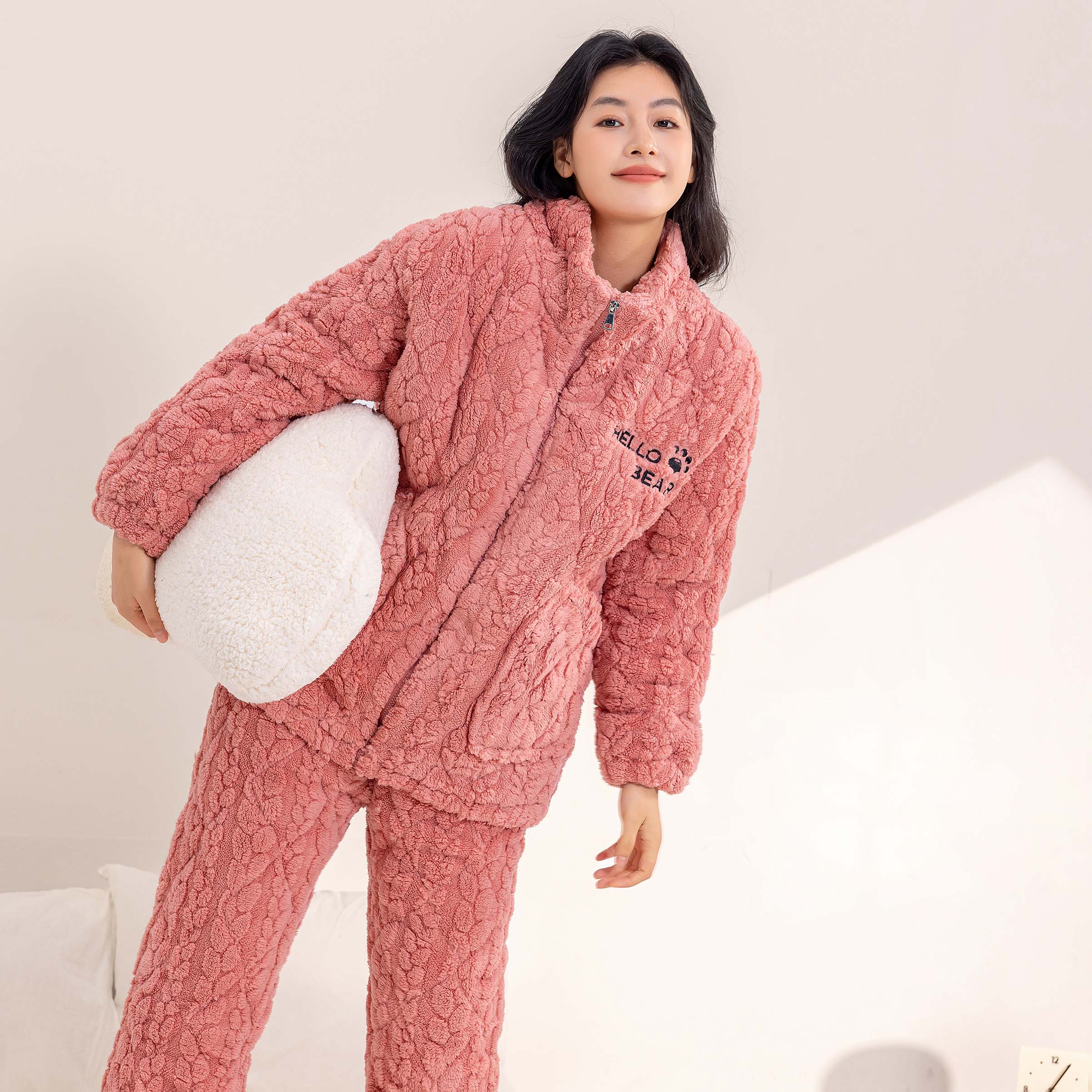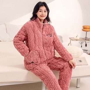 大码 春秋开衫 女士家居服 加厚珊瑚绒睡衣女冬法兰绒加绒套装 秋冬季