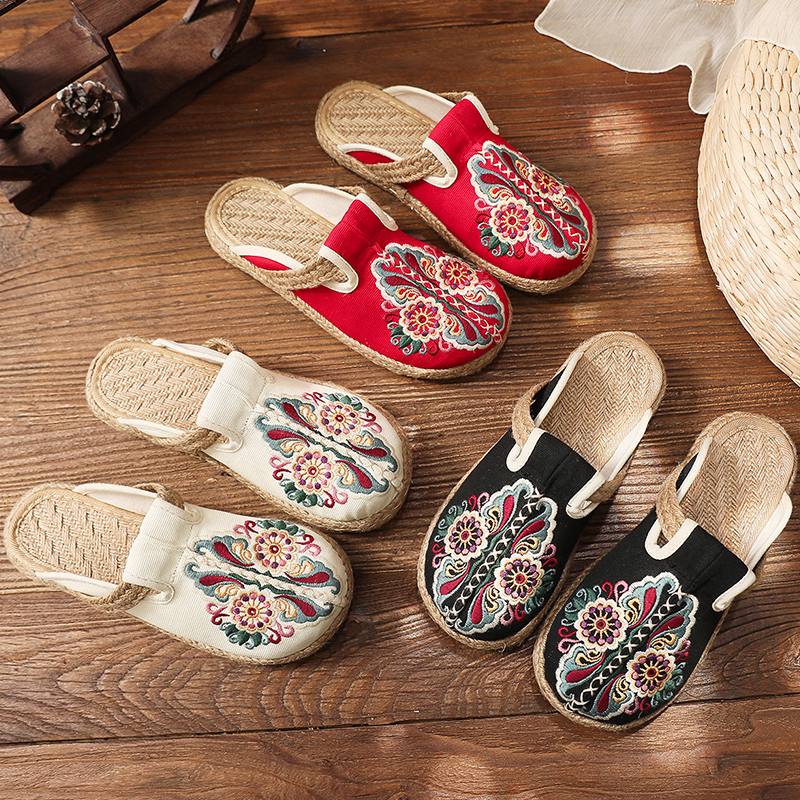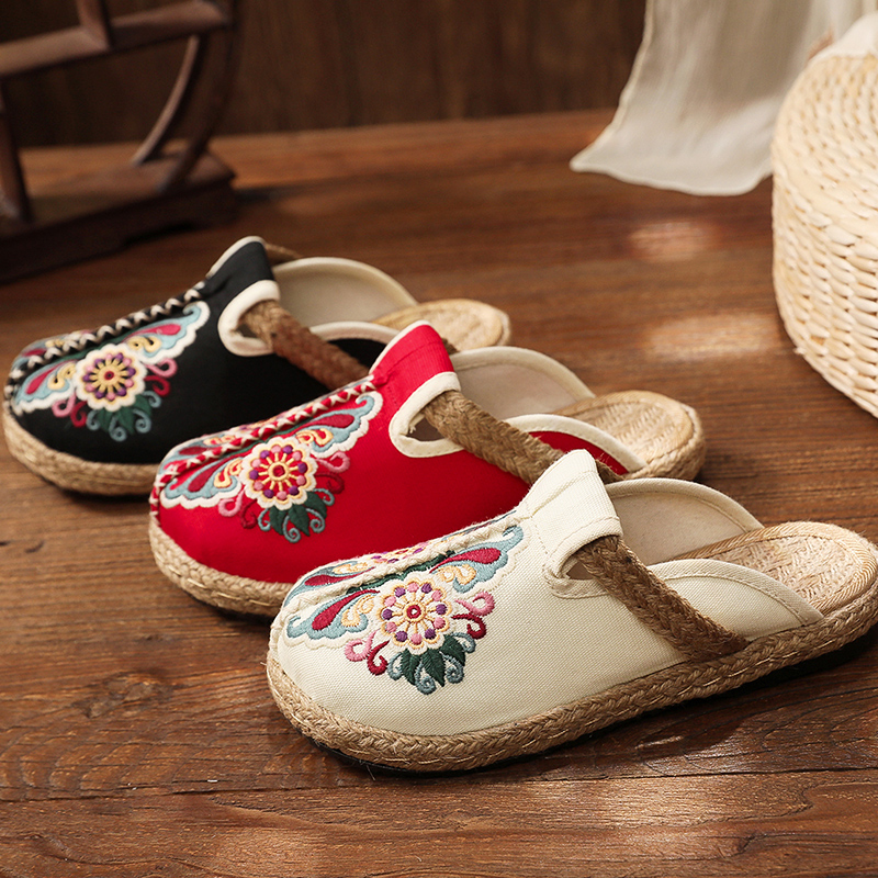 绣花一脚蹬女士亚麻布拖鞋 民族风潮流古风时尚 女新款 老北京布鞋