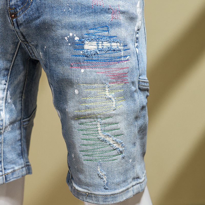 男五分裤 5分弹力薄款 夏季 乞丐补丁潮牌马裤 青年破洞 中裤 牛仔短裤