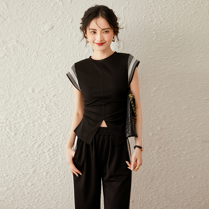 T恤休闲裤 白鹿语气质撞色条纹时尚 开叉针织修身 夏款 2件套女 套装