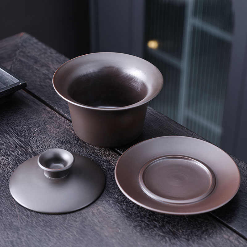 紫陶可悬停旋转盖碗三才泡茶碗紫砂三泡台高档功夫茶具茶杯带盖子