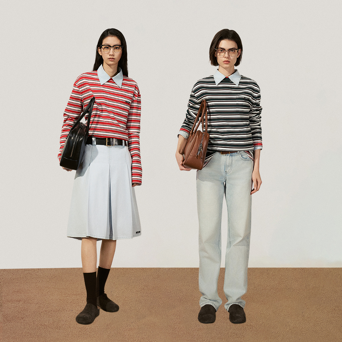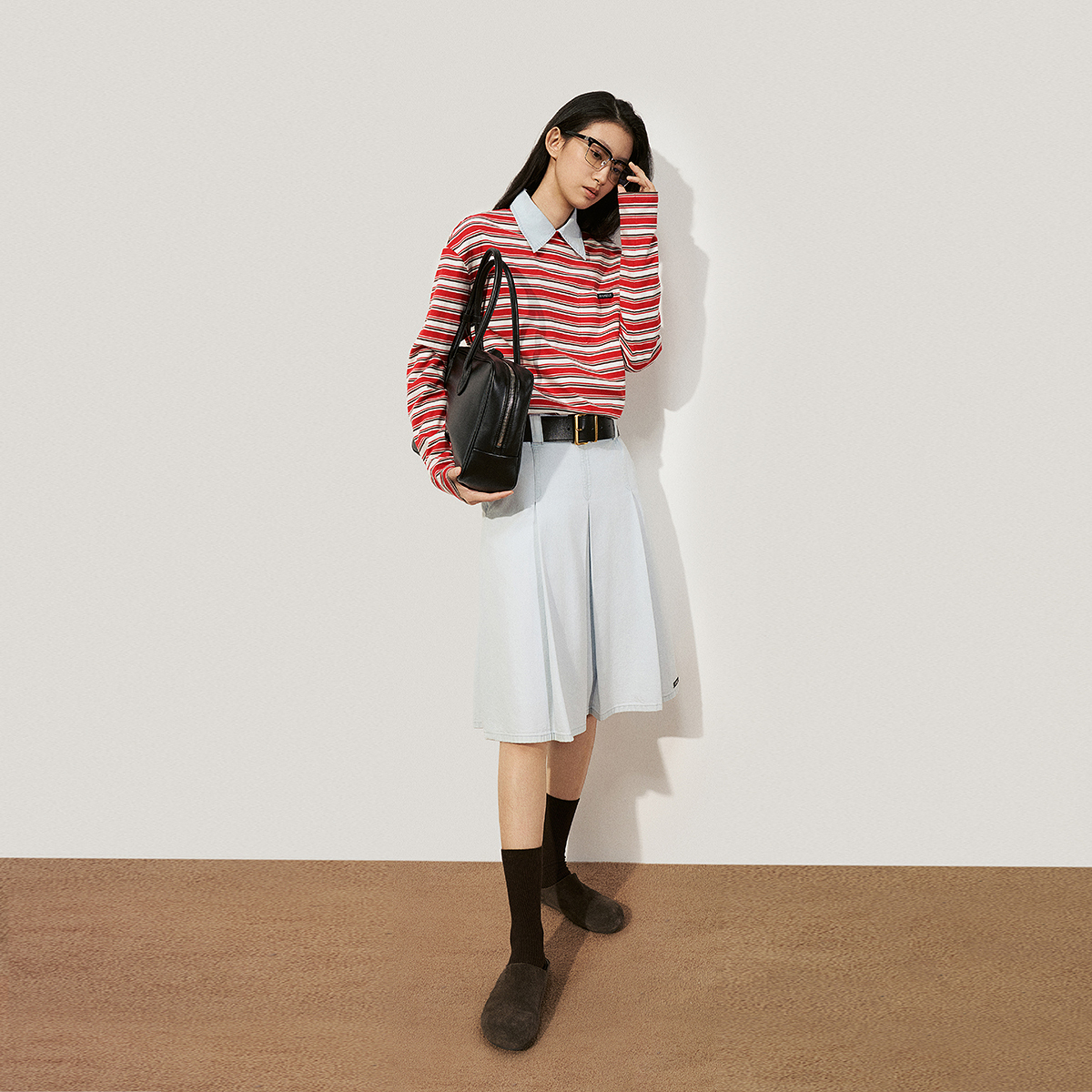 2025秋冬尖货 t恤女上衣条纹中长款 OCHIRLY欧时力 100%长绒棉长袖