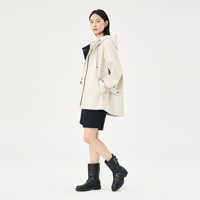 OTT2025春季 宽松连帽一手长抽绳风衣女圆弧下摆休闲撞色外套 新款