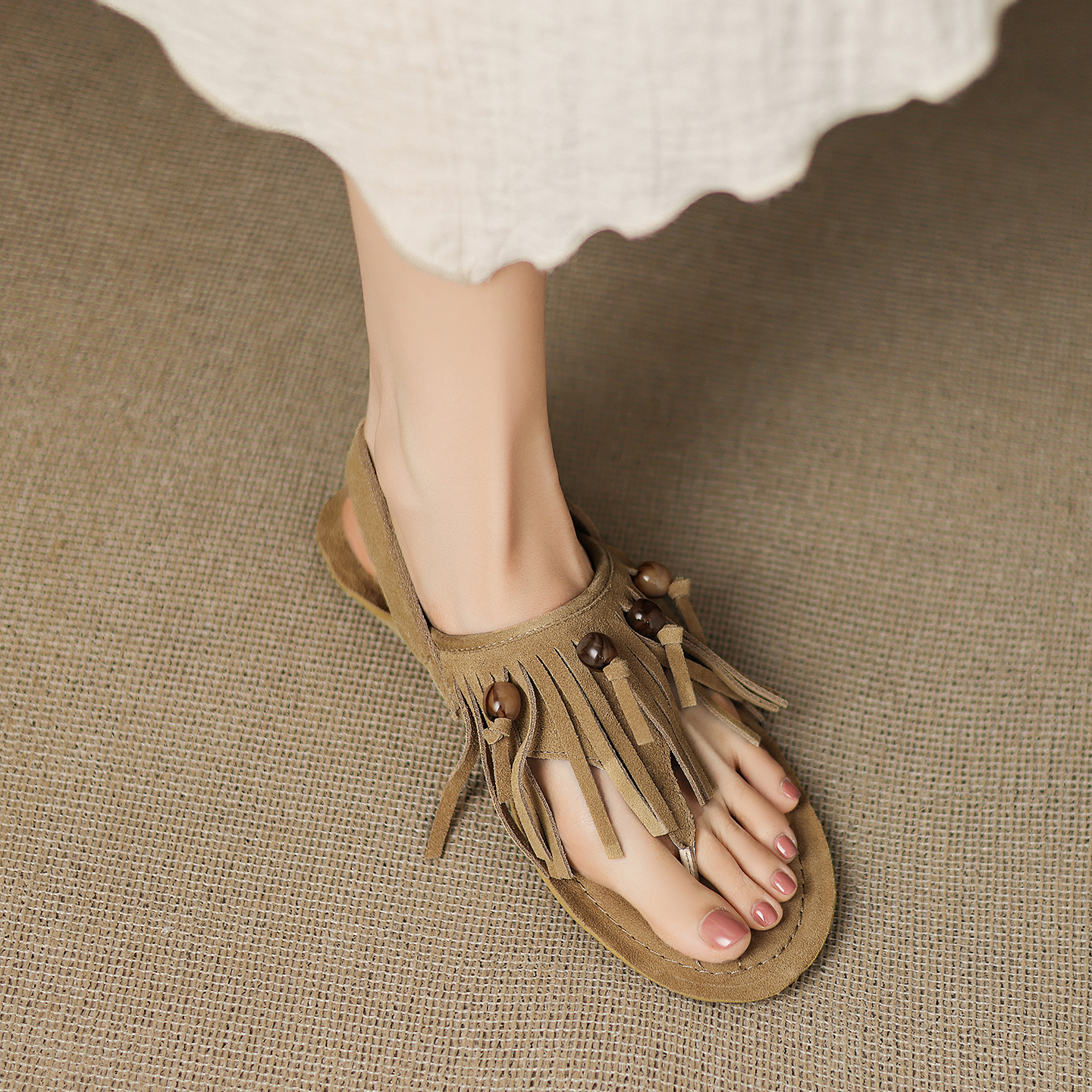 女 流苏串珠牛反绒加宽脚掌设计文艺夹趾凉鞋 开怀依足 城市游牧