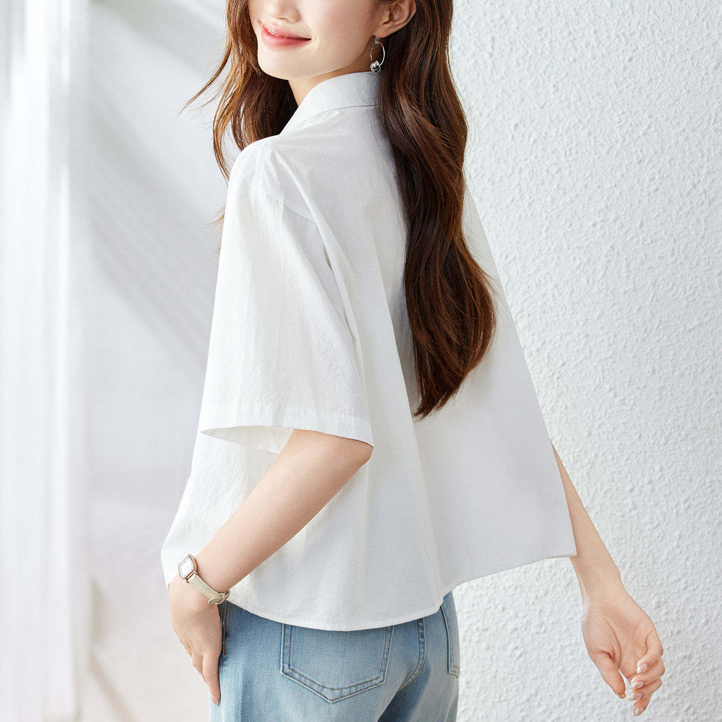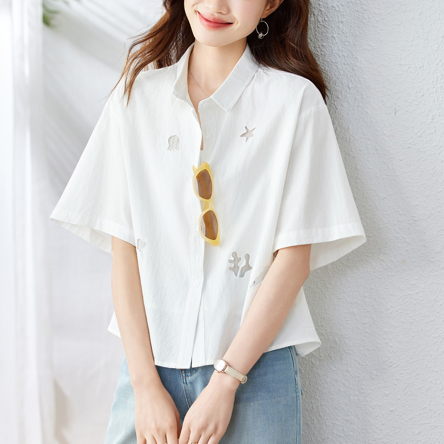 2025夏季 女五分袖 设计感镂空上衣宽松休闲纯棉衬衣 白衬衫 初影