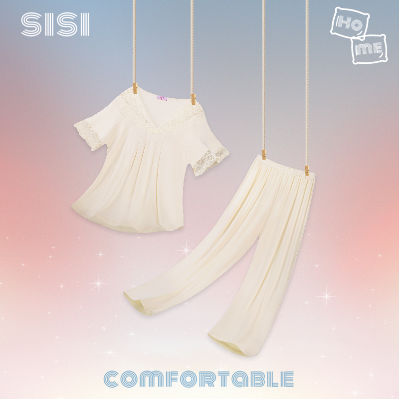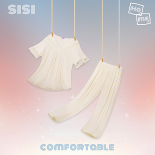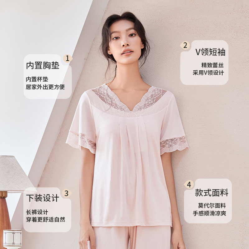 家居服套装 带胸垫长裤 免穿文胸睡衣莫代尔 博尼V领花边短袖 Bonny