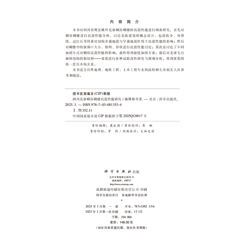 社新华书店正版 四川羌寨碉房碉楼抗震性能研究陈臻林等建筑 科学出版 新 水利