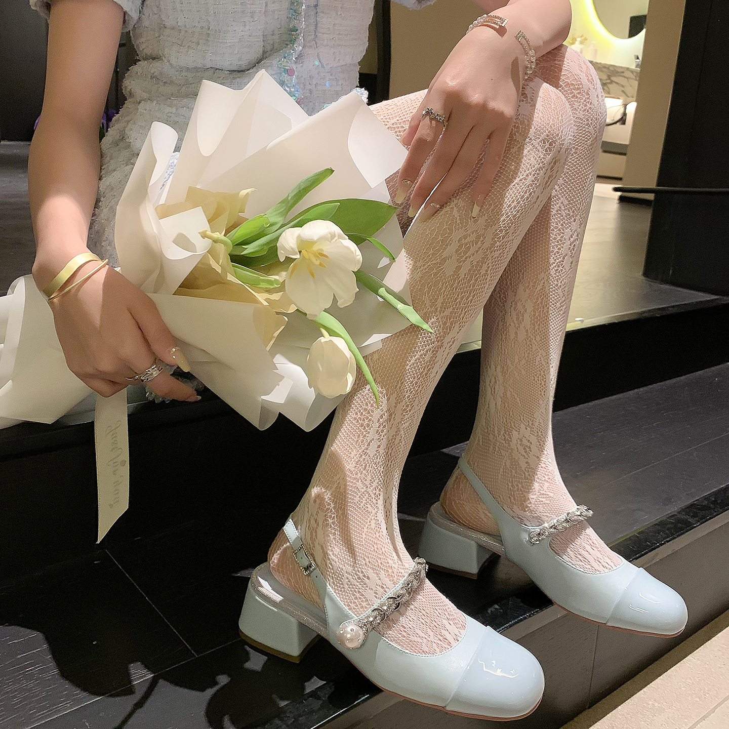 配裙子圆头粗跟凉鞋 开怀依足2025夏季 珍珠链条后空单鞋 法式 女 新款