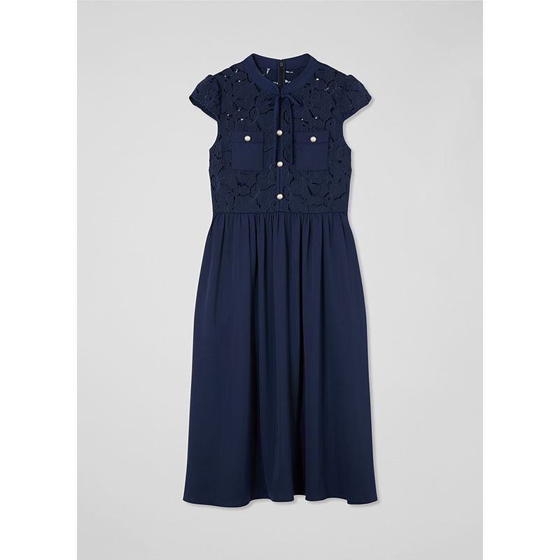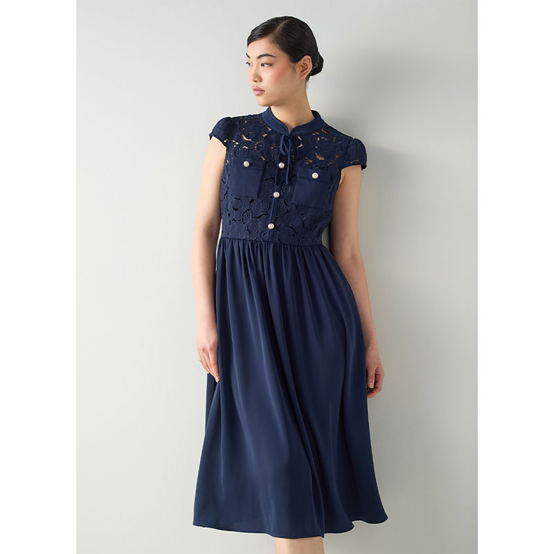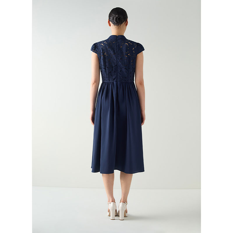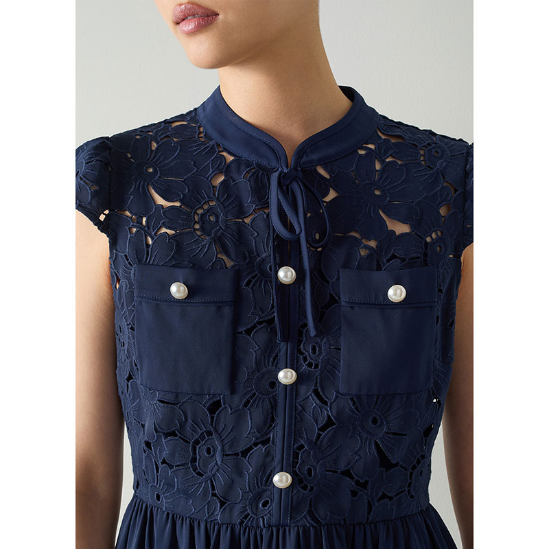 小立领绣花镂空气质中长款 lkbennett深蓝色连衣裙2025年夏季 新款