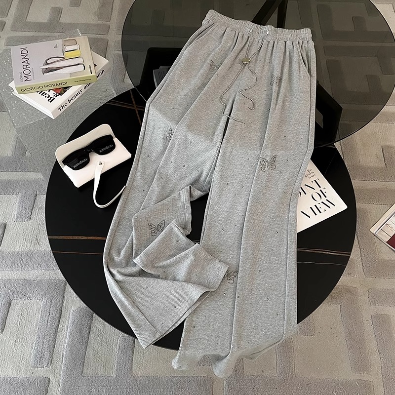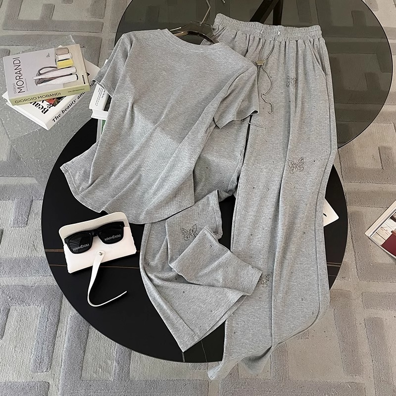 两件套潮 洋气显瘦上衣高腰阔腿裤 灰色烫钻蝴蝶休闲运动套装 女夏季
