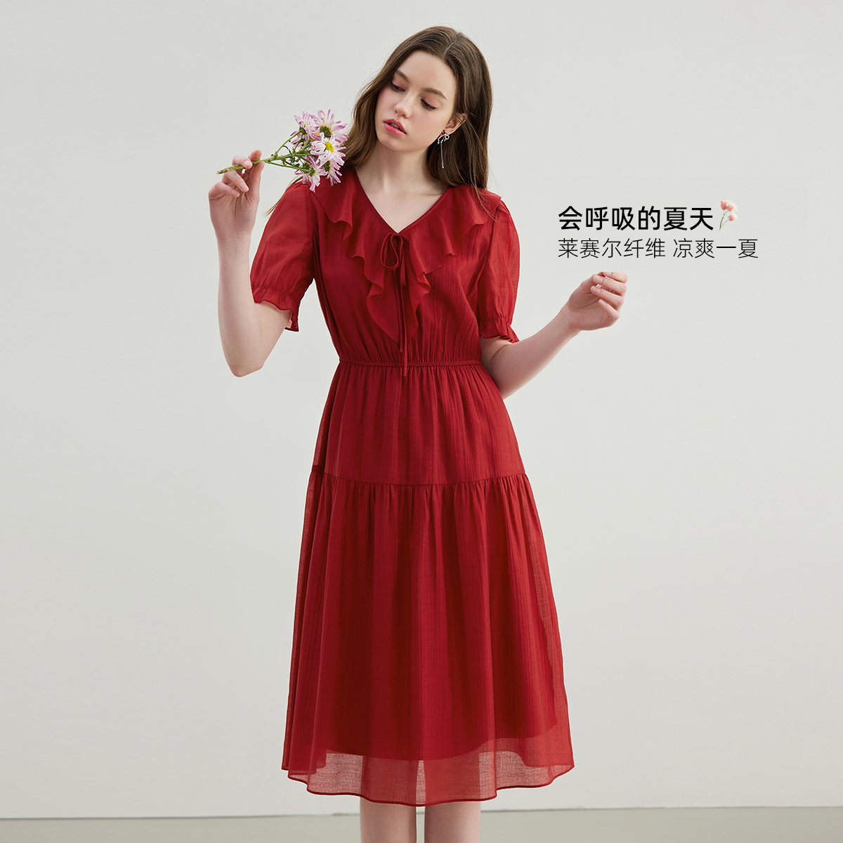 KBNE连衣裙女淡蓝色莱赛尔荷叶边V领长裙夏季 度假风裙子 2025新款