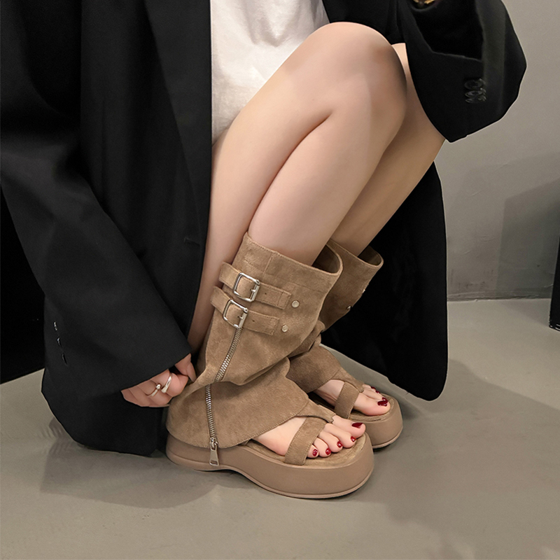 管堆堆高筒沙滩凉鞋 小个子厚底裤 新款 复古夹趾罗马凉靴女2025夏季