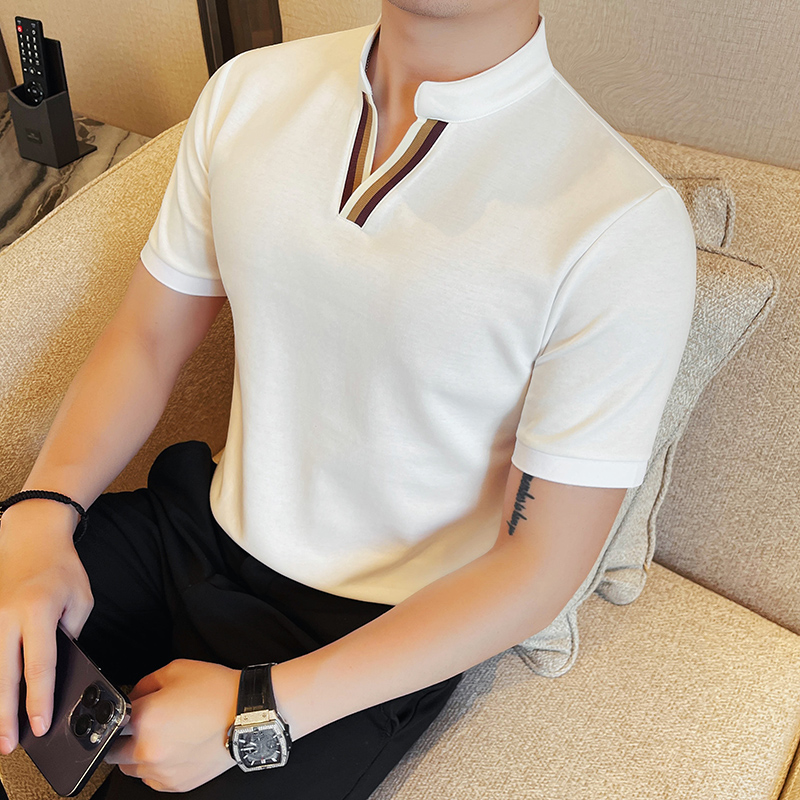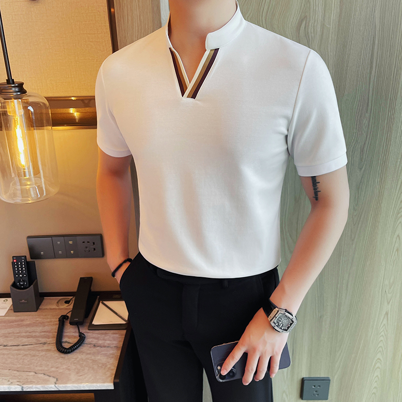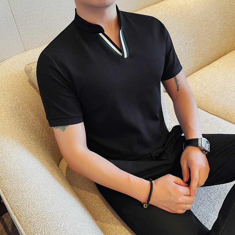 v领polo衫 撞色立领t恤男款 短袖 冰丝高级感痞帅风2025新款 夏季 男士